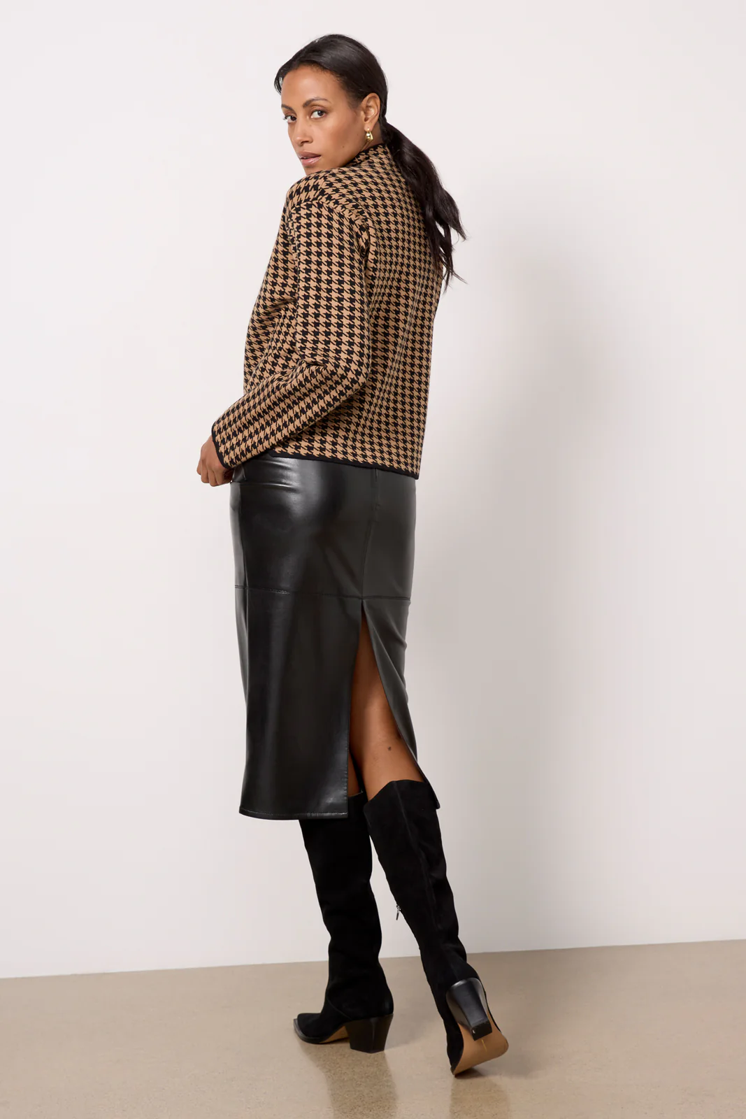 This sheen faux-leather skirt from Good American features a midi-length silhouette, a zipper closure, and a back slit for added ease and comfort.