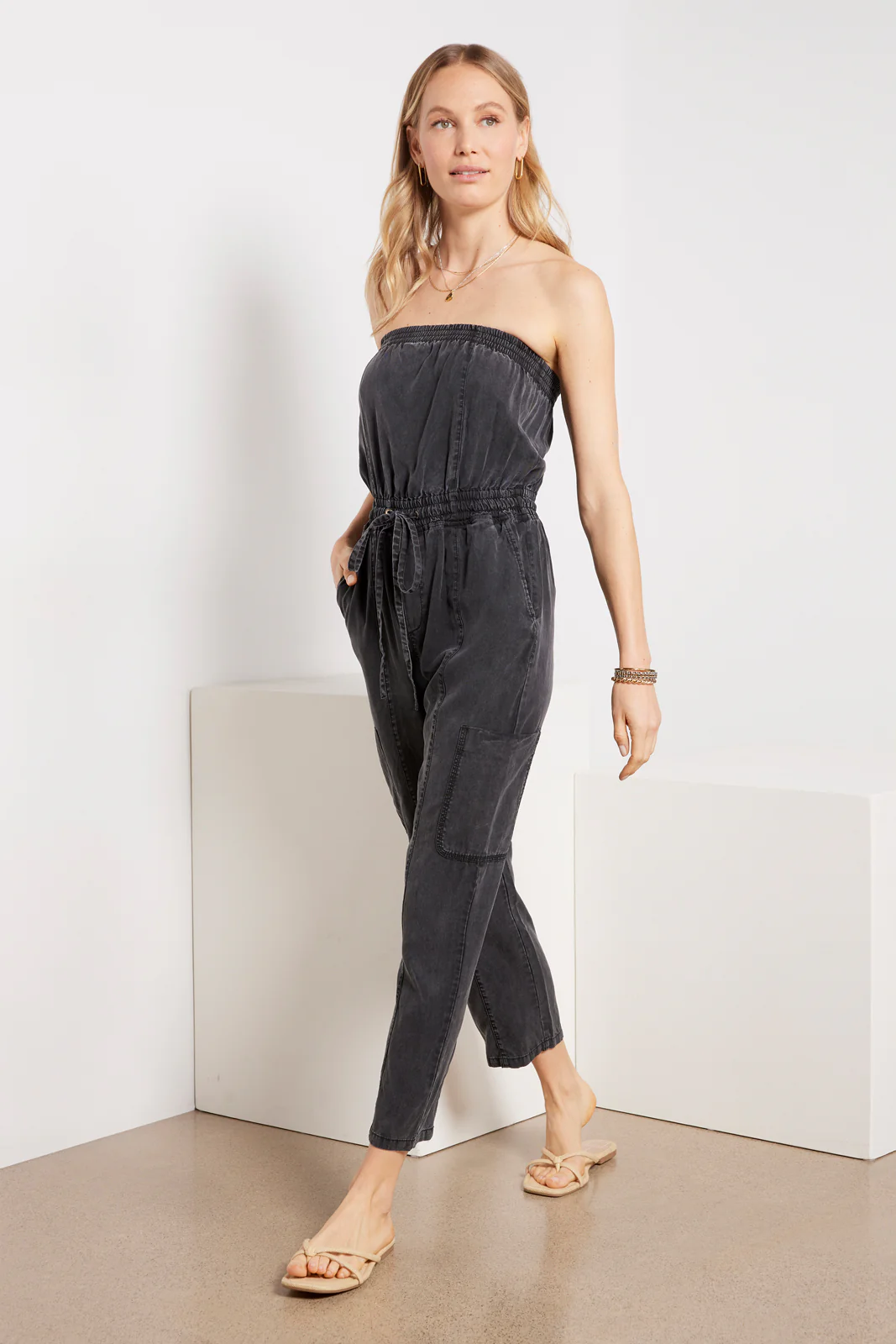 Crafted in soft lyocell fabric, this EVEREVE jumpsuit will take you from day to night in style. An elastic tie waist flatters this one-and-done piece, featuring a strapless silhouette and relaxed leg with cargo side pockets. Just add your favorite wedges, slides, or sneakers.
