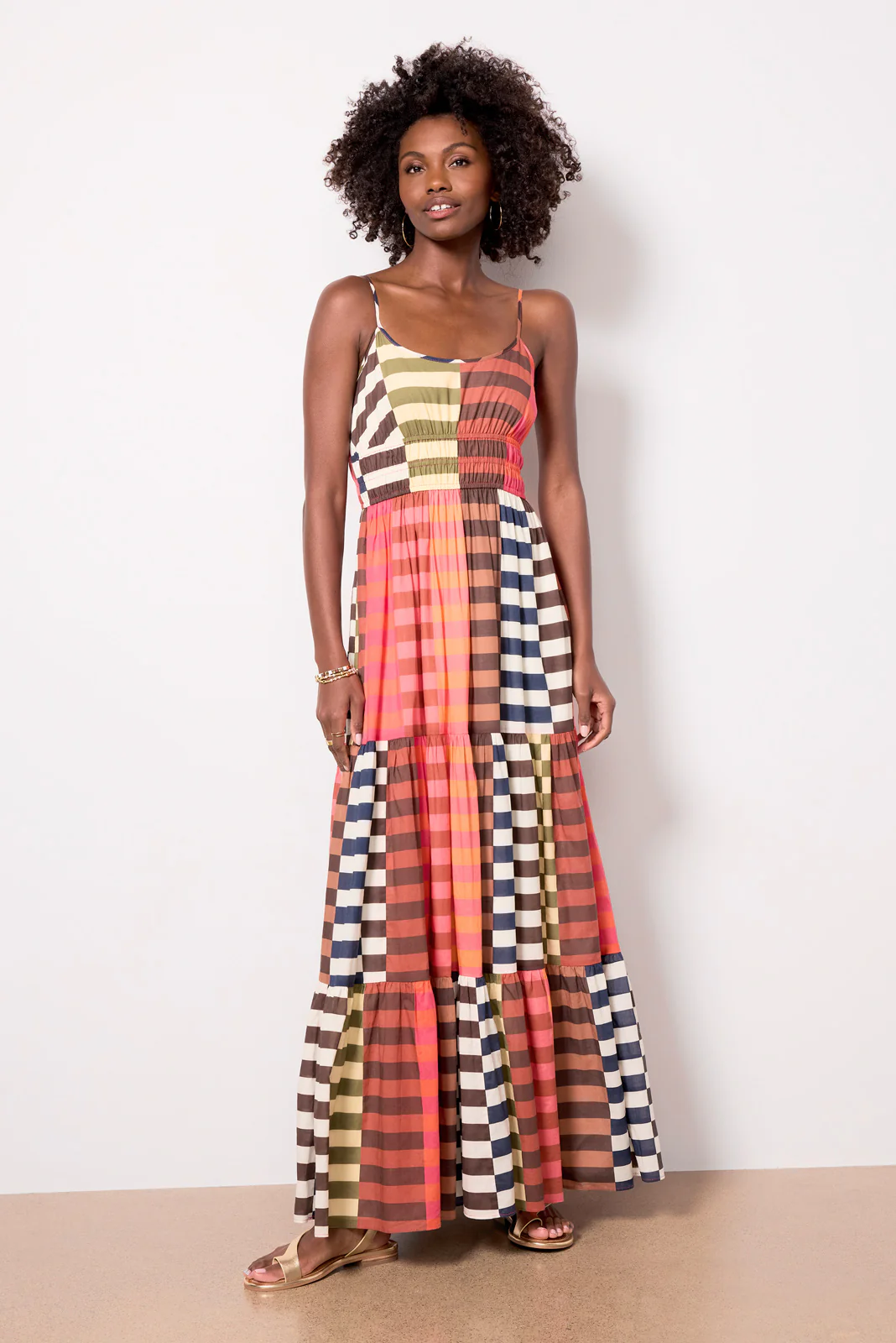 Turn heads in the Silvana Maxi Dress by Hutch, featuring a gorgeous multi-color, two-tone stripes, elastic waistband, adjustable straps, and a tiered maxi skirt.Â